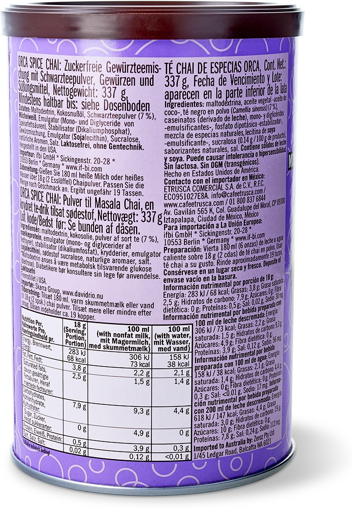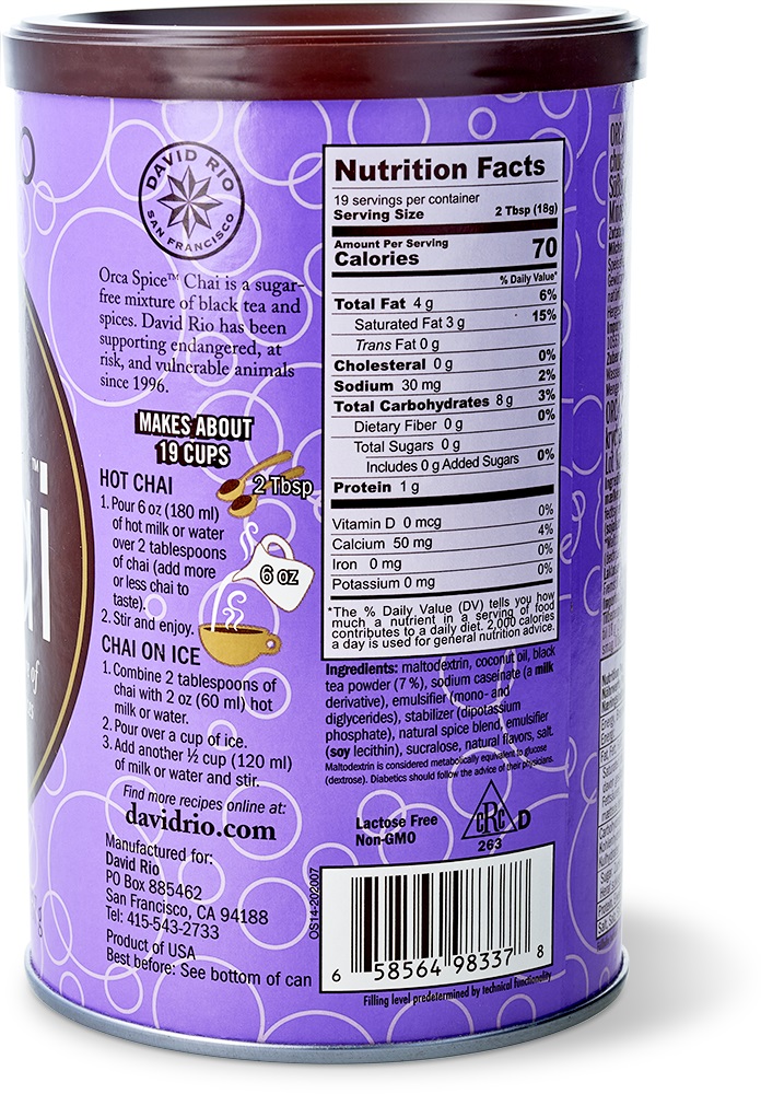 David Rio's zuckerfreier Chai Latte Tee mit den typischen Chai Gewürzen Ingwer, Zimt, Kardamom und Nelken. Statt Zucker kommt in diesem Chai Sucralose zum Einsatz.