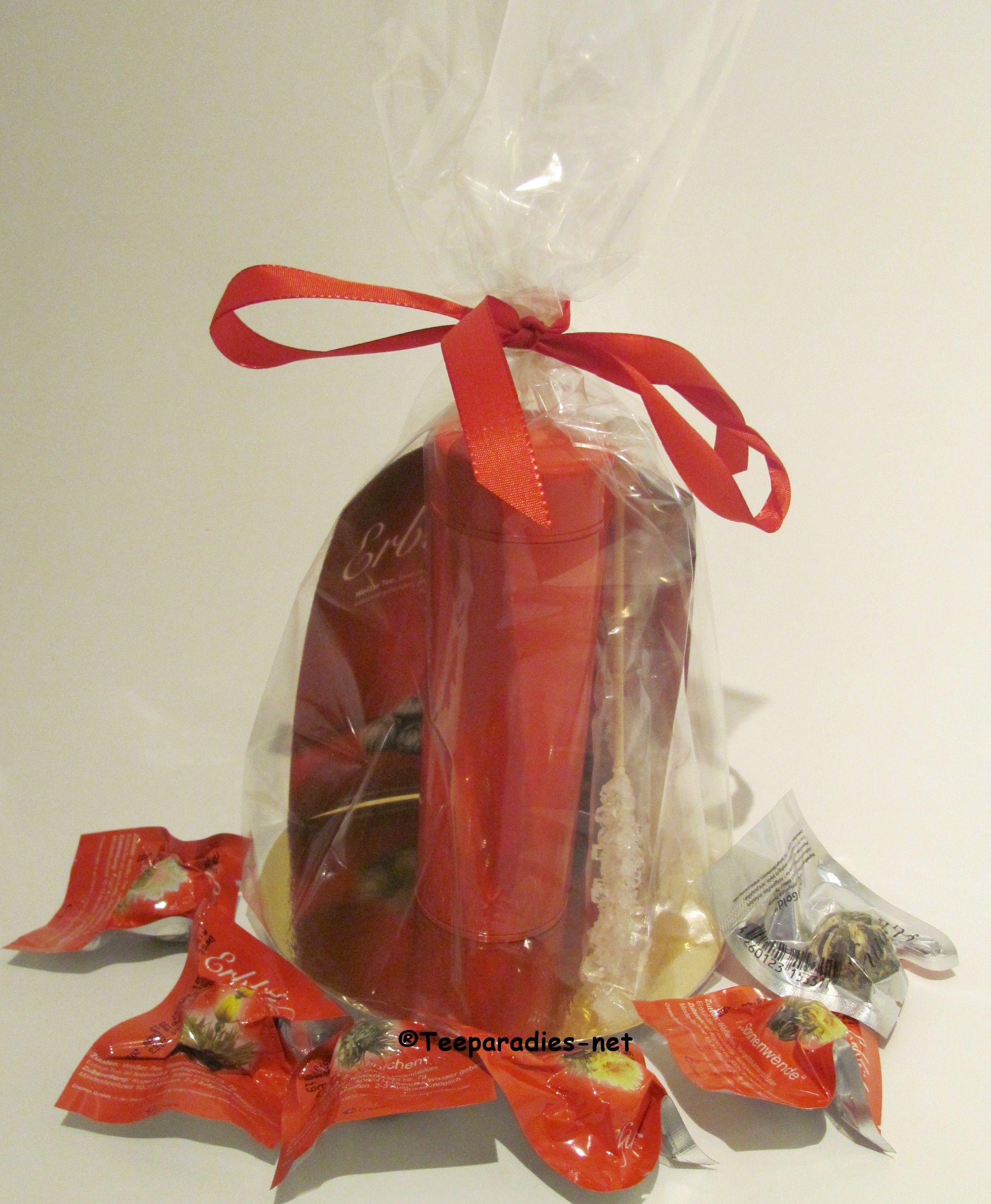 Das Teepräsent beinhaltet in Folientüte mit Kartoneinlage goldfarbig mit rot farbigen Schleifenband, gern zu Weihnachten mit Weihnachtsband, dann bitte Info: