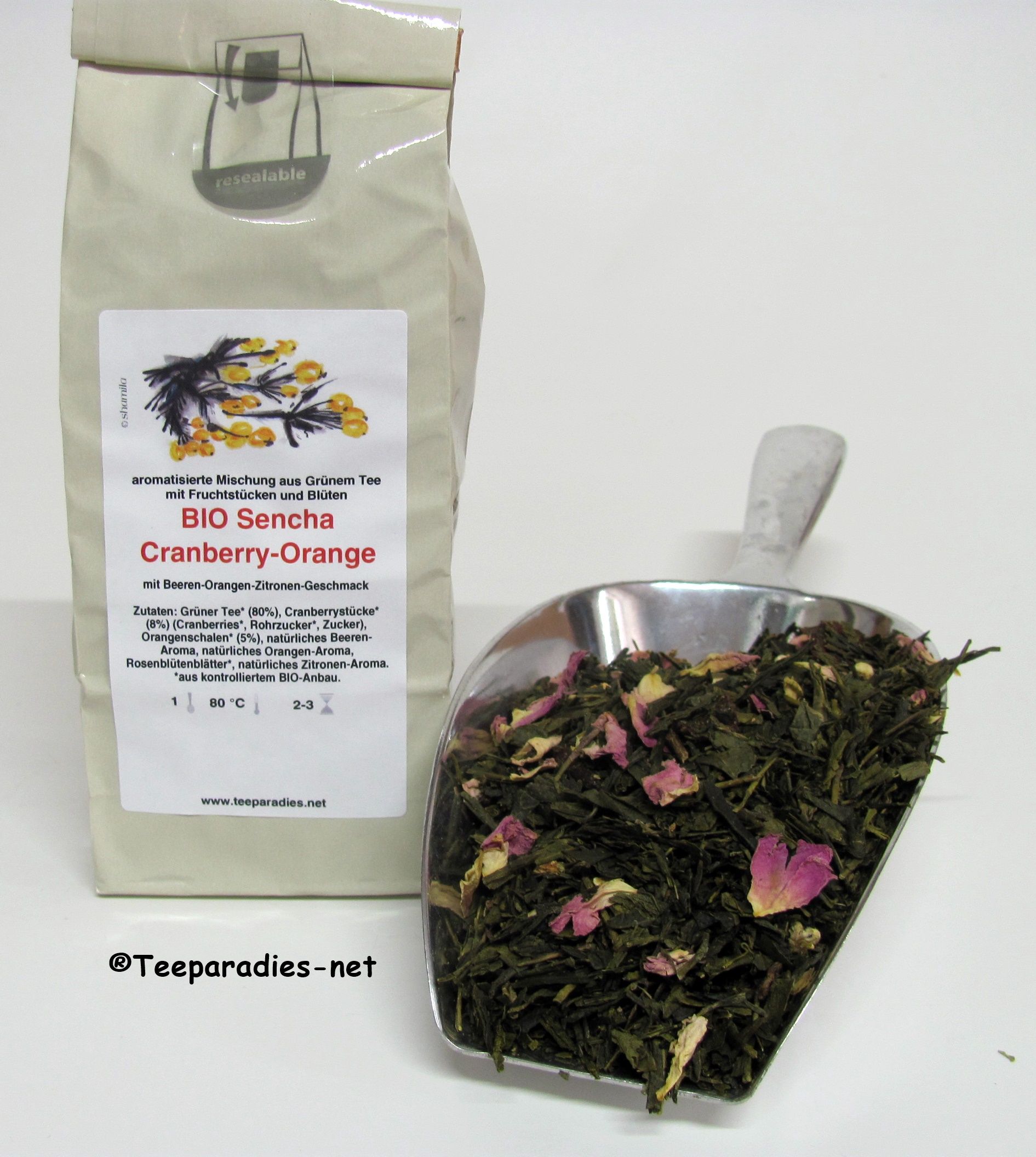 Ingredients: green tea * (80%), cranberry pieces * (8%) (cranberries*, cane sugar*), orange peels* (5%), natural berry flavouring, natural orange flavouring, rose petals*, natural lemon flavouring.