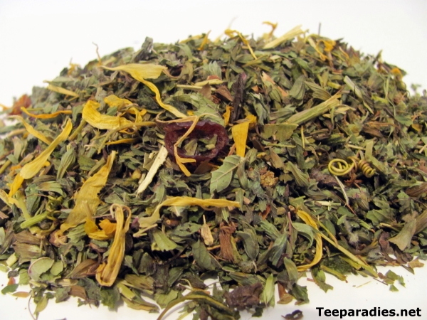 Melissenblätter, Hagebutten, Baldrian, Kümmel, Kamille, Fenchel, Anis, Hopfen, Pfefferminz und Ringelblumeblüten.