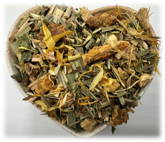 Zutaten: Zitronengras, Ingwerwurzel, Orangenschalen, Nanaminze, Zitronenverbene, Melisse, Zitronenschale, Ingweraroma, Ringelblumenblüten aus kontrolliert biologischem Anbau.