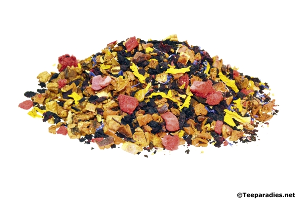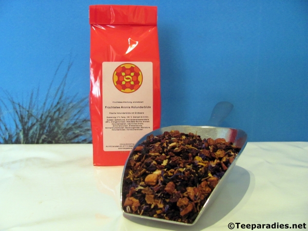 Enthält: Apfelstücke, Aroniabeerenbestandteile (25%), Orangenschalen, Rote Beete Stücke, Aromen, Holunderbeeren, natürliches Aroma, Zichorienwurzeln, Säurungsmittel: Weinsäure, Erdbeerstücke, Sonnenblumenblüten, Holunderblüten, Kornblumenblüten.