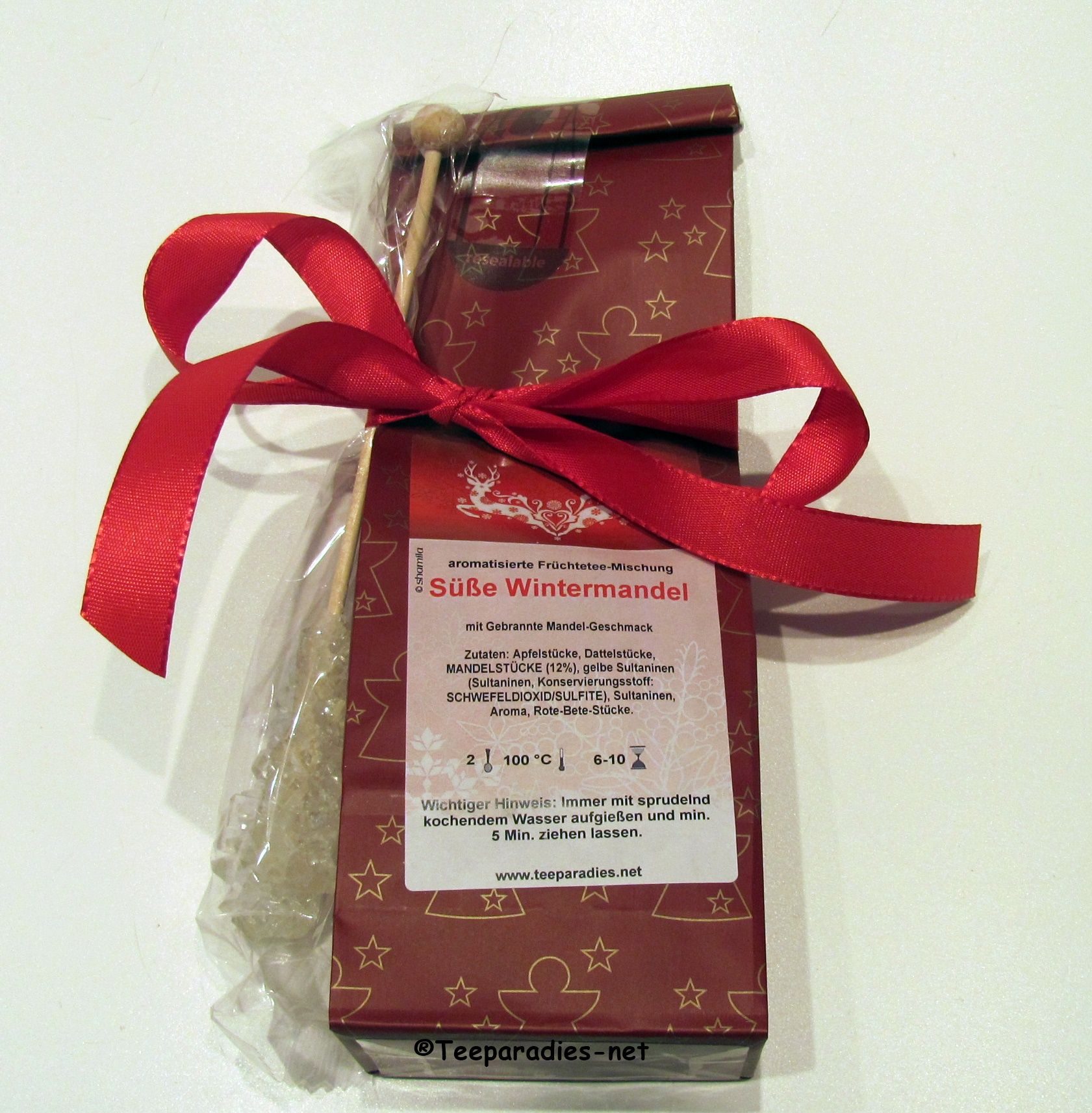 Teepräsent: Süße Wintermandel Früchtetee & 1 weißer Kandisstick mit rotem Band