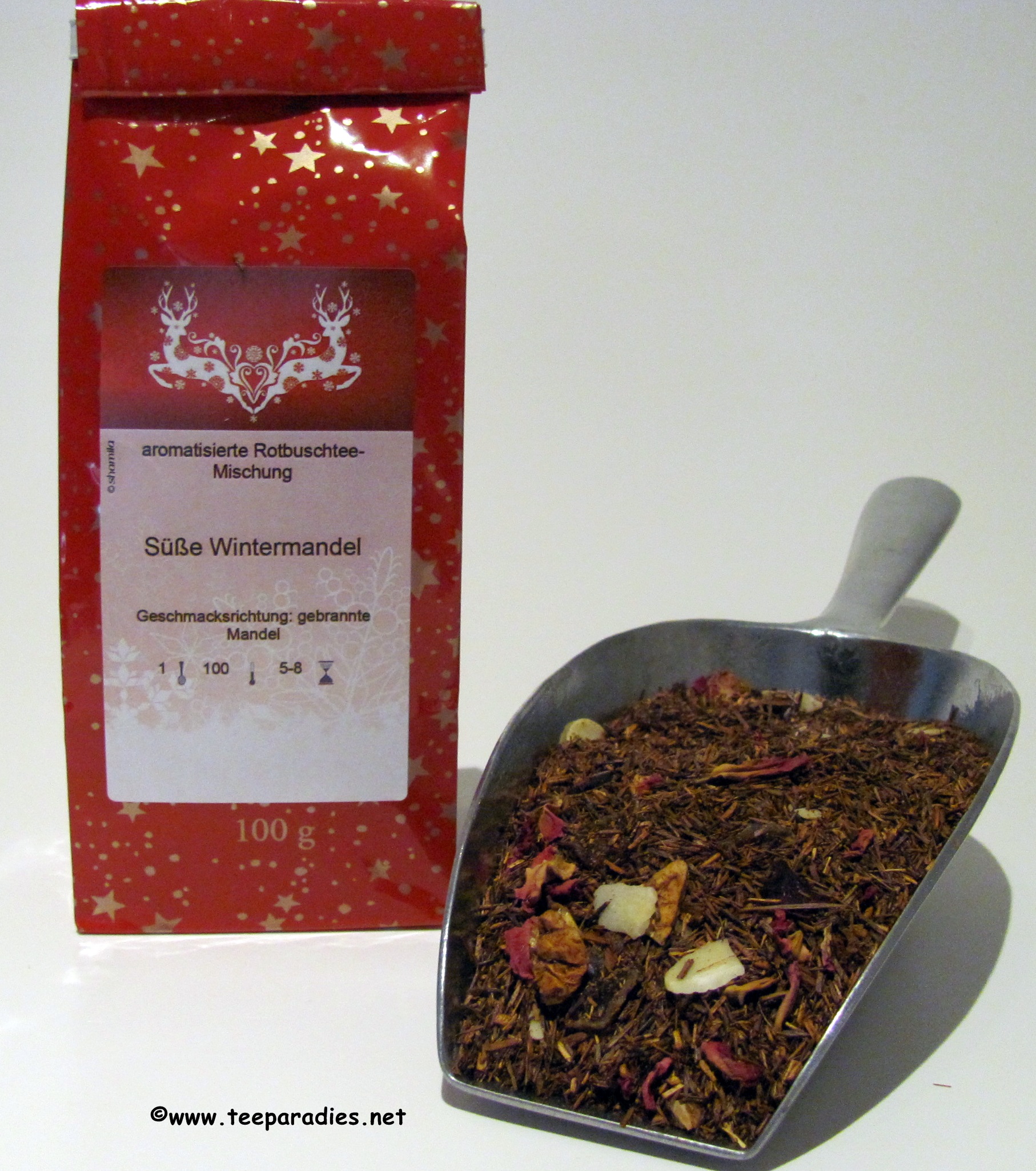Ingredients: rooibos tea, ALMOND BITS (7%), apple bits, yellow sultanas (sultanas, preservative: SULPHUR DIOXIDE/SULPHITES), sultanas, date bits, flavouring, beetroot bits, rose petals.