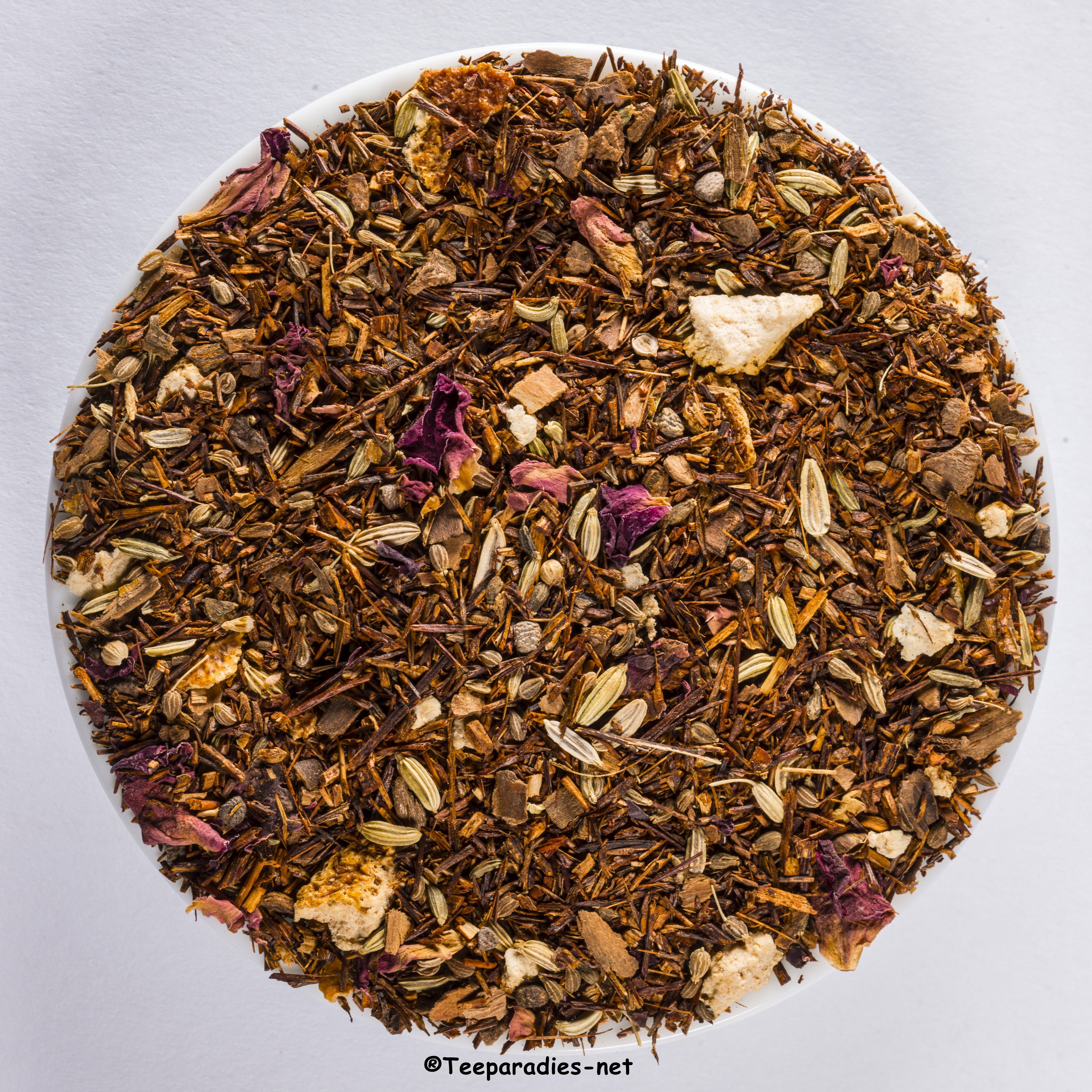 Ingredients: rooibos (PDO) (58%), orange peel, fennel, cinnamon pieces, aniseed, rose flower petals red, cardamom seeds, natural flavour, flavour