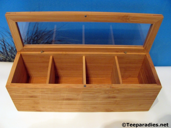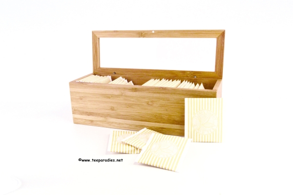 Diese Teebeutelbox ist sehr exklusiv und aus hochwertigem Bambusholz. Sie hat einen Scharnierdeckel mit Kunststofffenster.