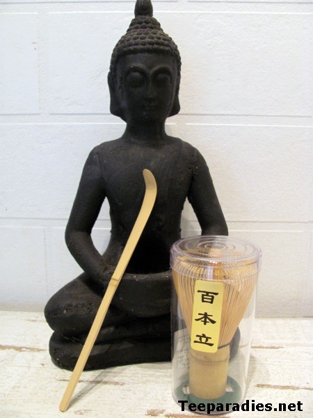 Zum Verkauf stehen der Chasen und der Matchalöffel (die Buddha-Figur dient beim Foto zu Dekozwecken, unverkäuflich).