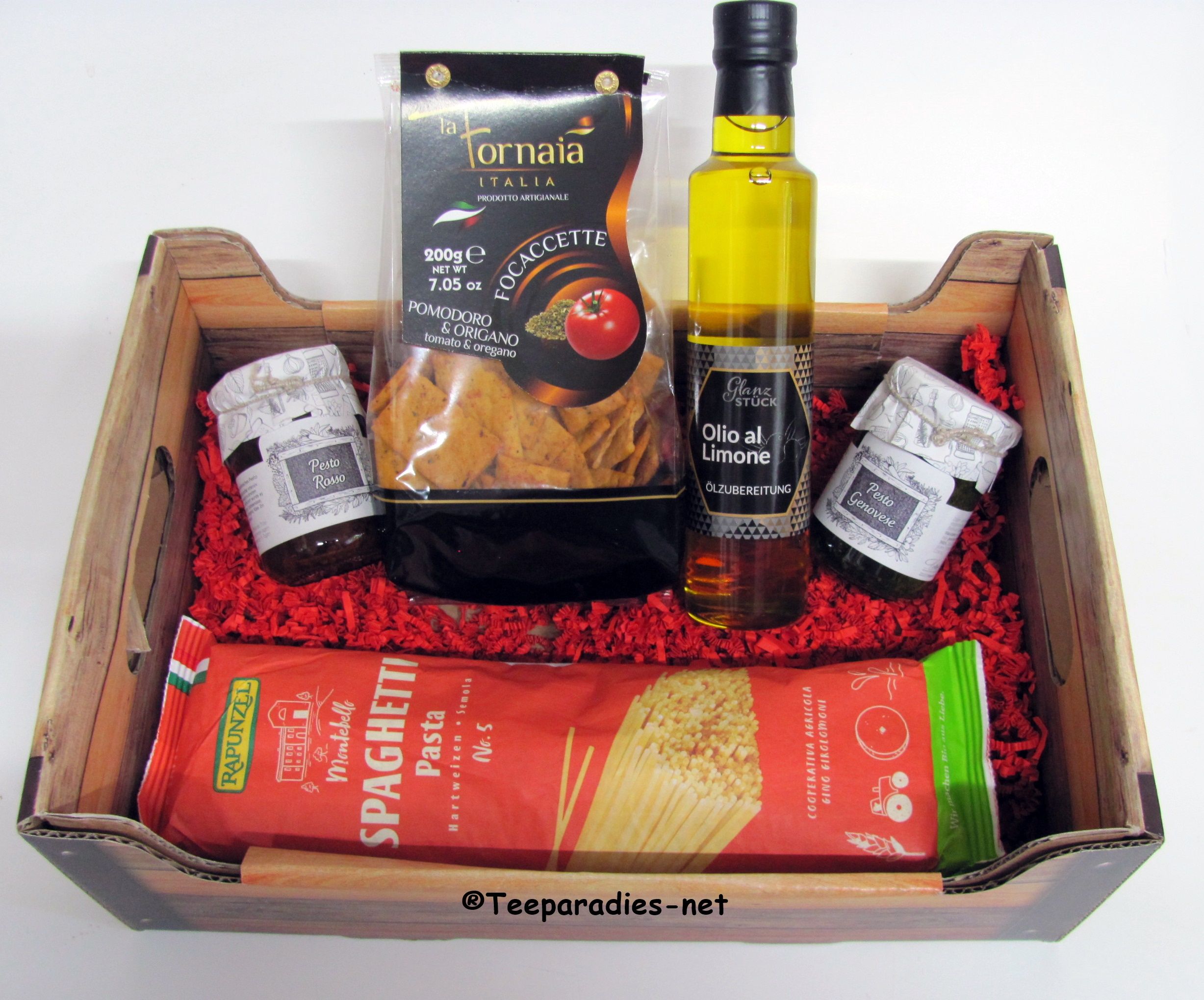 Schlemmerpräsent „Sommerabend“ (Artikel Nummer: A-1417) Bestehend aus:• 200 g. Focaccette mit Tomate und Oregano (lecker zum Knabbern)• 250 ml. Collier: Olio al Limone Ölzubreitung Öl im Glas• 135 g. Collier: Pesto Rosso• 135 g. Collier: Pesto Genovese• 500 g. Rapunzel Spaghetti Semola, no.5 Verpackt in einem Präsentkarton: Steige Country, groß mit aufgedruckter Holzoptik Innenmaße: 330x220x125mm(L/B/H) … Weiterlesen